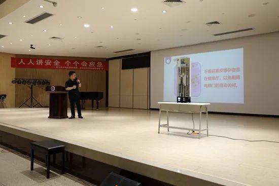 “大家知道乘坐自动扶梯有哪些注意事项吗?电梯运行中突然停电不动了该怎么办呢?”活动现场,市特种设备协会的工作人员化身“讲解员”,通过发放宣传资料、图文并茂的PPT、动画短片等方式,直观地为同学们介绍了乘客电梯、自动扶梯和自动人行道的运行原理和安全保护装置,详细讲解了安全注意事项和文明乘梯的相关知识,让学生深刻感受到了电梯安全的重要性。