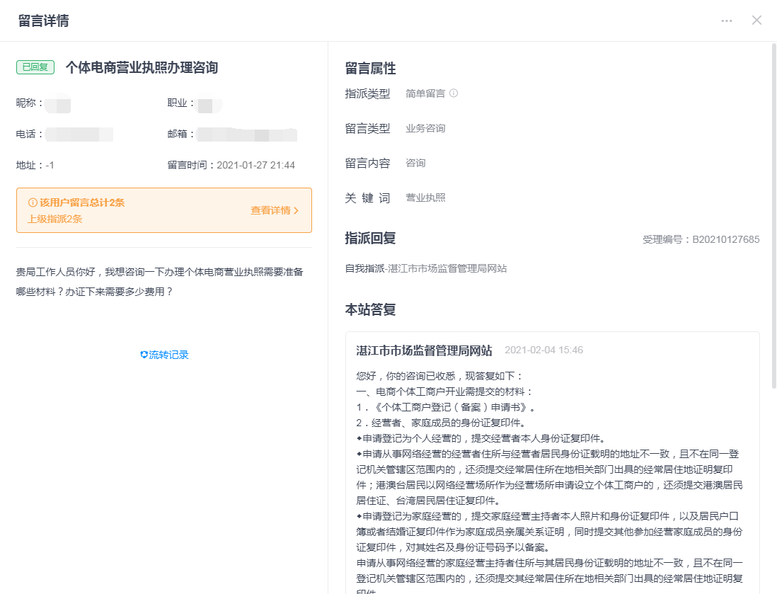 2021年1月,我局网站“留言中心”共收到网友留言1条,已办结1条。