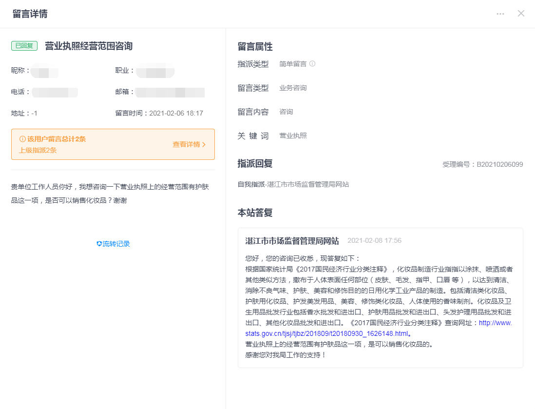 2021年2月网上留言办理情况