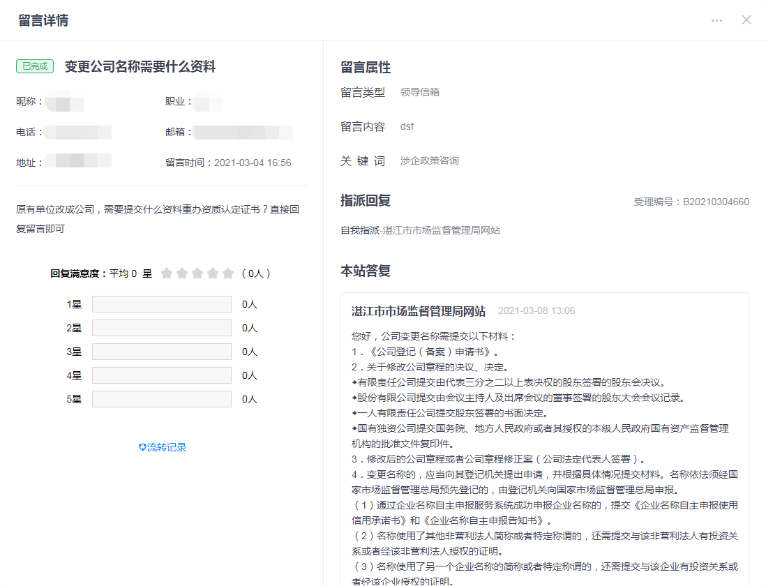 2021年3月网上留言办理情况