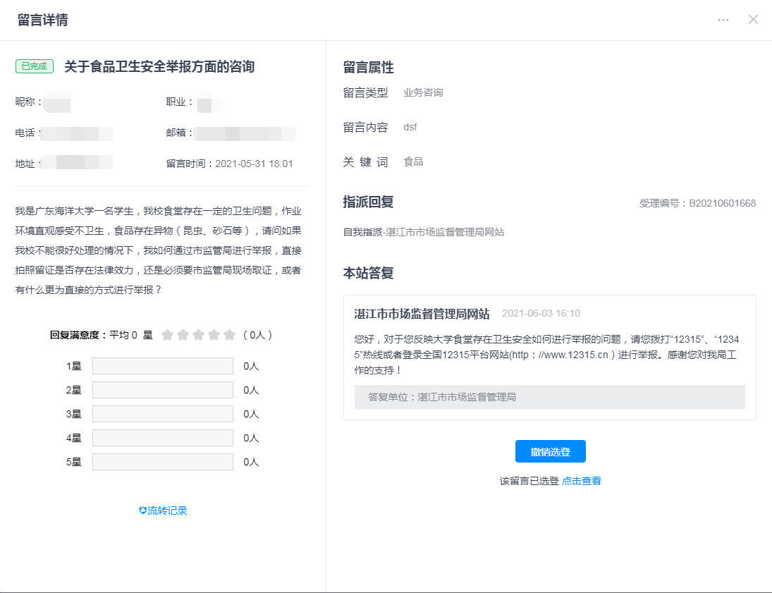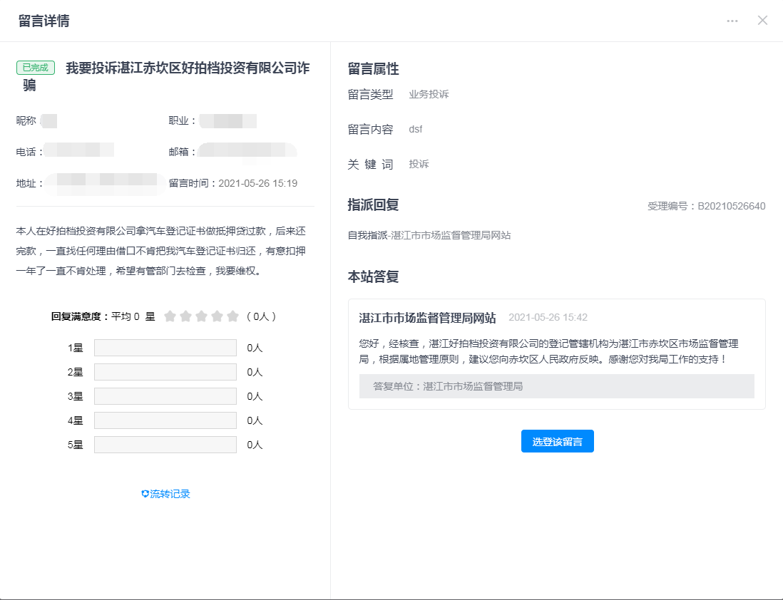 2021年5月,我局网站“留言中心”共收到网友留言3条,已办结3条。