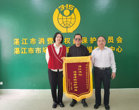 近日,湛江市消委会收到一面“湛江消协  消费者的保护神盾”的锦旗,消费者李小姐和她父亲表示:“感谢市消委会的大力支持,帮助我维权起诉,我才能成功维护我的合法权益。”