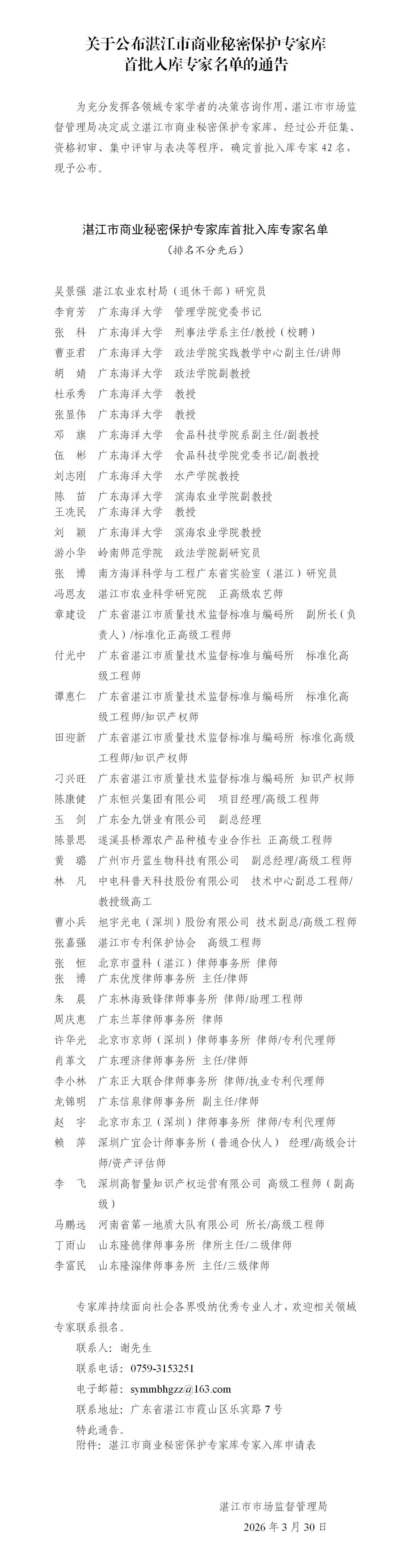 关于公布湛江市商业秘密保护专家库首批入库专家名单的通告