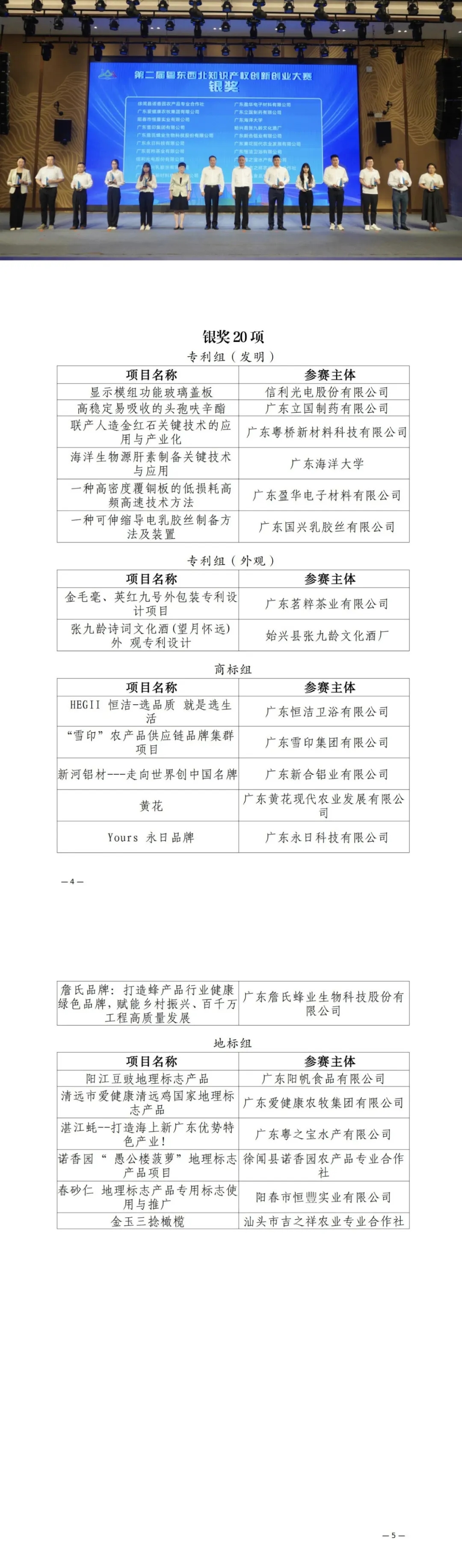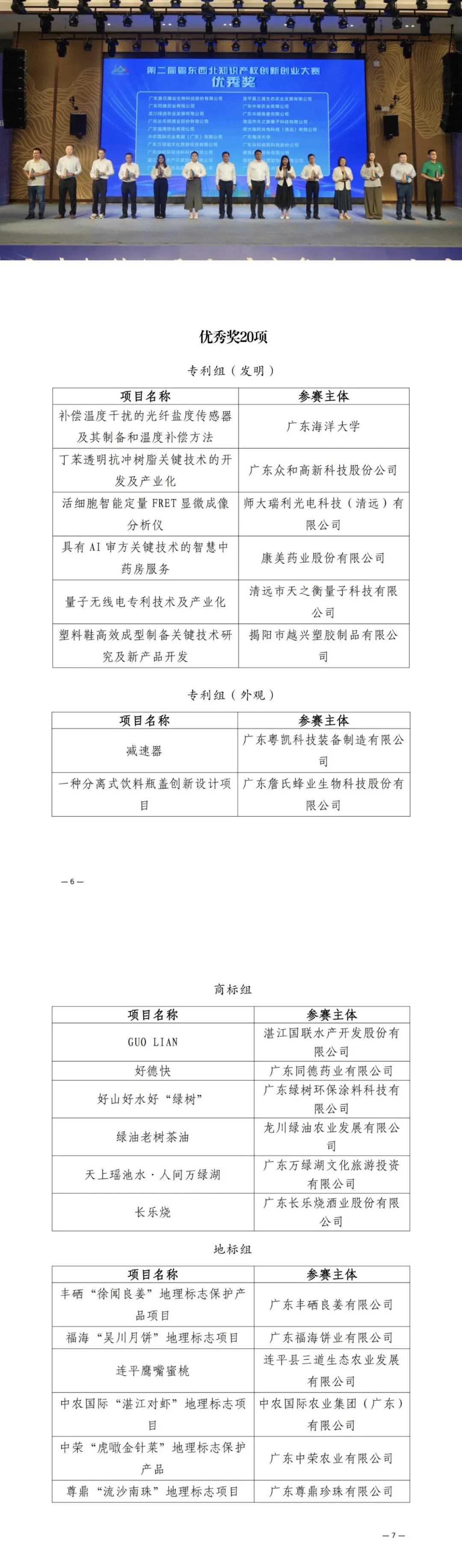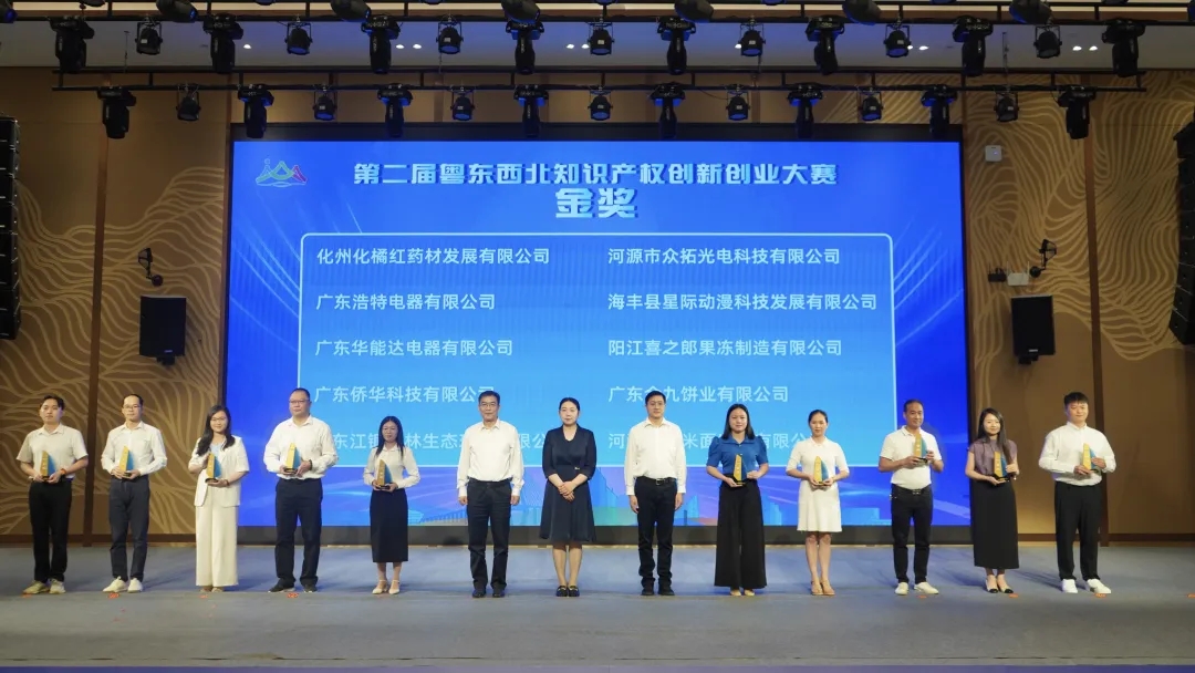 7月2日上午 第二届粤东西北知识产权 创新创业大赛颁奖仪式在湛江举行 现场为获得金奖、银奖和 优秀奖的代表进行颁奖 颁奖仪式现场。 粤东西北12地市知识产权转化运用及成果情况。 陈新烈指出,广东知识产权局将深入贯彻落实省委、省政府关于实施创新驱动发展的战略部署,坚持以科技创新开辟新赛道、塑造高质量发展新动能。粤创赛要继续聚焦解决产业升级等“卡脖子”难题,把重心放在强化专利转化、商标品牌运用、地理标志产品推广上,进一步吸引创新成果在粤东西北地区“落地生根”。粤东西北各地市要大力推动知识产权创造运用,增强知识产权转化效益。希望广大创新主体持续推进产学研用深度融合,加快推动将创新成果转化为现实生产力。 会场外展出了部分优秀作品。 出席活动的领导嘉宾分别为 获奖单位代表进行颁奖 广东江铜桃林生态环境有限公司、河源市众拓光电科技有限公司、广东侨华科技有限公司 海丰县星际动漫科技发展有限公司、广东华能达电器有限公司、阳江喜之郎果冻制造有限公司 广东浩特电器有限公司、广东金九饼业有限公司、化州化橘红药材发展有限公司、河源合成米面制品有限公司 粤桥新材料、国兴乳胶丝、广东海洋大学 永日科技、雪印集团、恒洁卫浴、恒豐实业 粤之宝、爱健康农牧集团 阳帆食品、立国制药 银奖颁奖现场。 尊鼎珍珠、长乐烧酒业、同德药业 粤凯科技装备、康美药业、丰硒良姜 中农国际、国联水产、福海饼业 广东海洋大学、天之衡量子科技、绿树环保涂料 优秀奖颁奖现场。 值得一提的是,湛江以举办“粤创赛”为抓手,扎实推进知识产权强市建设,推动知识产权发展取得了明显成效。截至今年4月,全市发明专利有效量4209件,每万人口发明专利拥有量5.91件,同比增长20.6%;有效商标注册量累计突破8.12万件;3个项目荣获第二十五届中国专利优秀奖;拥有地理标志数量居全省第2位;2024年实现知识产权质押融资114.92亿元,同比增长78.3%。 现场发布了粤东西北 专利转移转化资源库信息 赛事共收集183条 知识产权转化运用供需资源 盘点粤东西北各地市高校 科研院所5200余条存量专利 为专利转化运用打造资源新阵地 为供需精准对接提供新平台 粤东西北专利转移转化资源池发布。 届时,广大企业可以通过访问 粤东西北知识产权创新创业大赛 官方网站查看相关信息 知识产权转移转化以及投融资意向合作签约。 交接仪式。 活动还进行了交接仪式 何嘉旻将象征粤创赛主办地的旗帜 交接给李培忠 李培忠再将粤创赛旗帜交给 第三届粤创赛举办城市——韶关市 标志着第二届粤东西北知识产权 创新创业大赛圆满落幕的同时 也正式开启了第三届赛事的新篇章